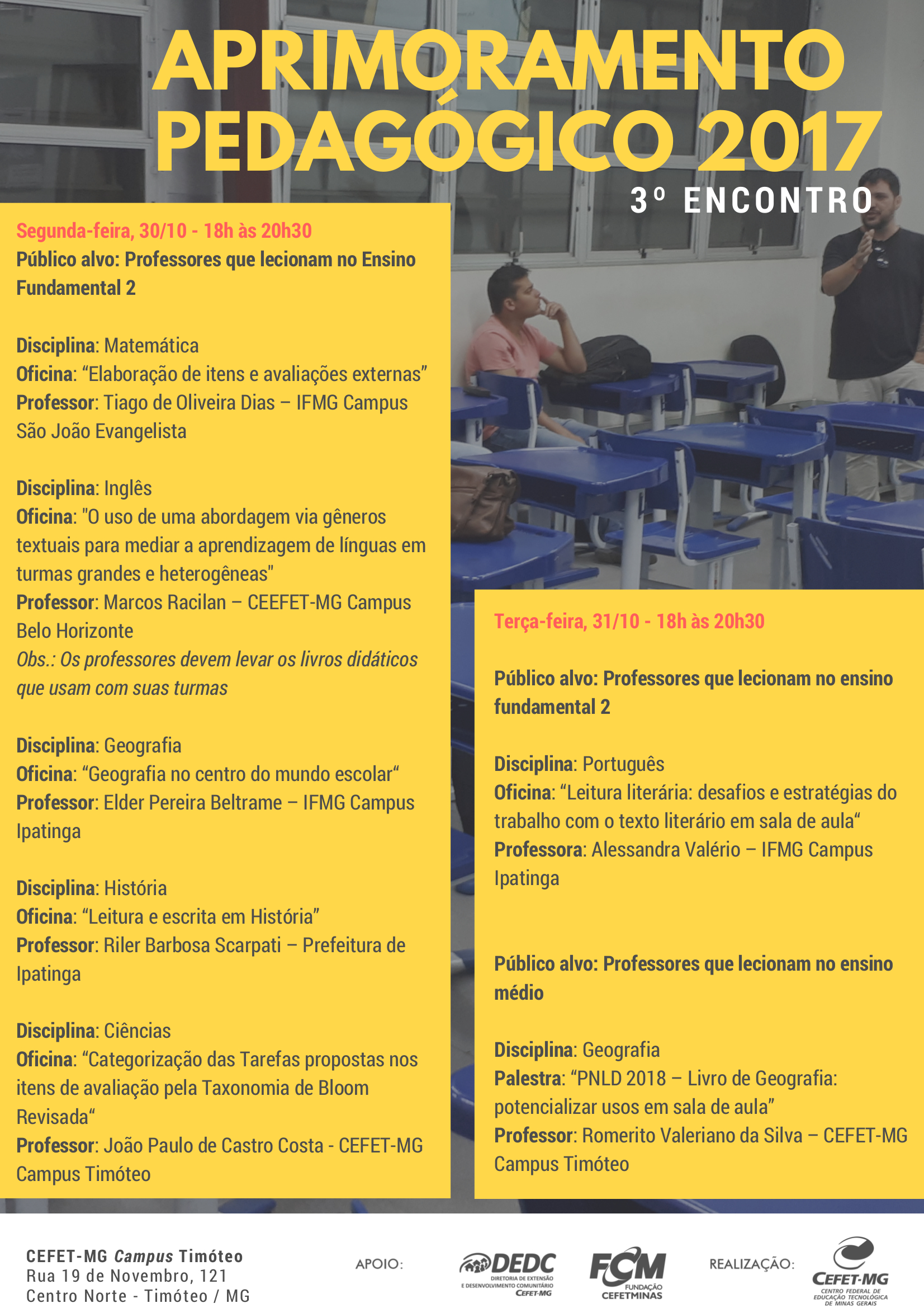 O campus Timóteo realiza, na próxima segunda-feira (30) e terça-feira (31), o terceiro encontro de 2017 do projeto de extensão Aprimoramento Pedagógico. Voltado a professores da rede pública do município de Timóteo, o projeto pretende contribuir para a formação continuada dos docentes, através de oficinas, minicursos e palestras.